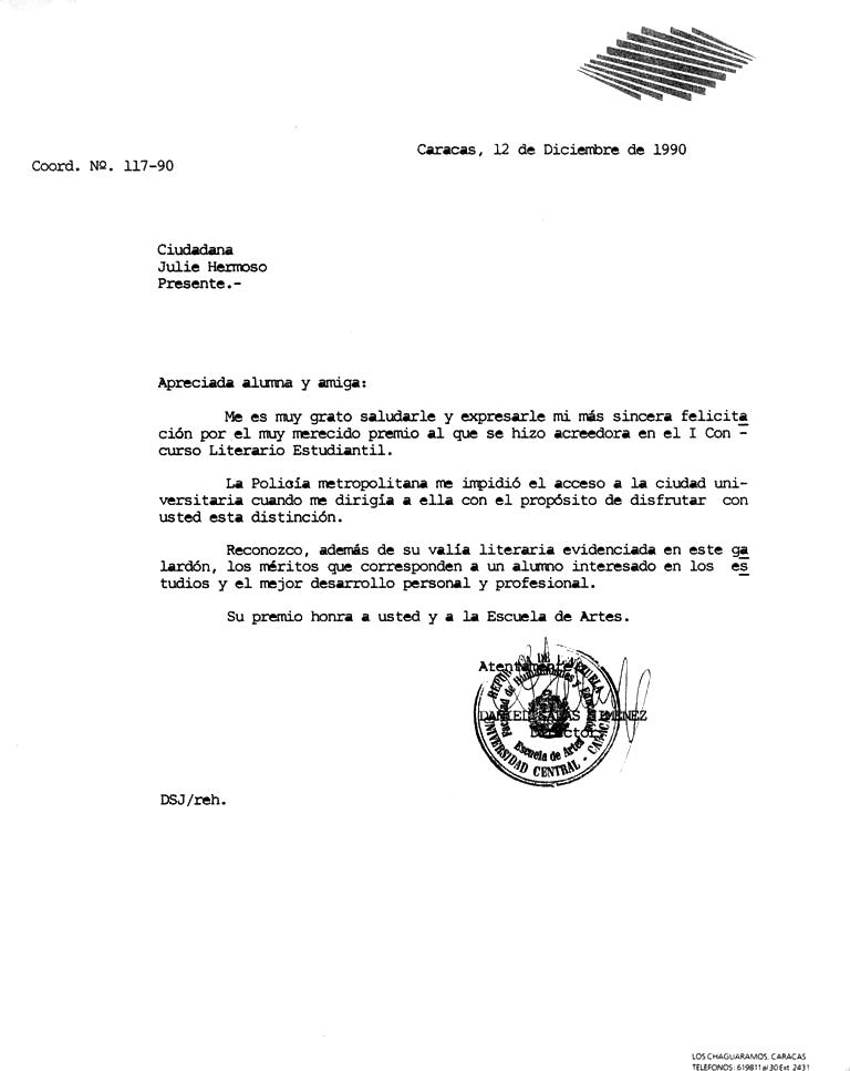 No todo era coser y cantar, el 12 de diciembre de 1990, Daniel Salas, entonces director de la Escuela de Artes de la UCV, me escribió: “Me es muy grato saludarle y expresarle mi mas sincera felicitación por el muy merecido premio al que se hizo acreedora en el I Concurso Literario Estudiantil. La Policía Metropolitana me impidió el acceso a la ciudad universitaria cuando me dirigía a ella con el propósito a disfrutar con usted esta distinción.”. Mientras estudie, religiosamente, cada jueves hubo enfrentamiento entre las fuerzas del estado y estudiantes que exigían justicia. Y es que el derecho a la libertad, a la diferencia, en Venezuela se respira: cada uno para si y Dios con todos, desde que salimos de la caverna llamada nacer y mientras vaya viniendo vamos viendo. Hugo Chávez fue el aglutinante que permitió que un gran número de excluidos ampliara nuestra democracia, mejorándola, volviéndola paritaria, participativa y protagónica; y mientras el vivió danzamos, cada uno a su aire, en el escenario de la humanidad, pues el gran sacrificado de la historia ha sido la persona. Y Hugo Chávez, con la suya arrolladora, estimuló a muchos, más allá del continente, a expresar con alegría el ser particular con el que Dios se esmera en crearnos. Ni siquiera dos hojas de un mismo árbol son iguales. Volvamos a la democracia.
